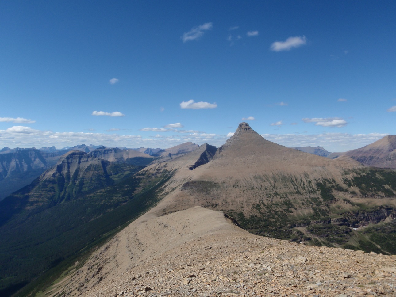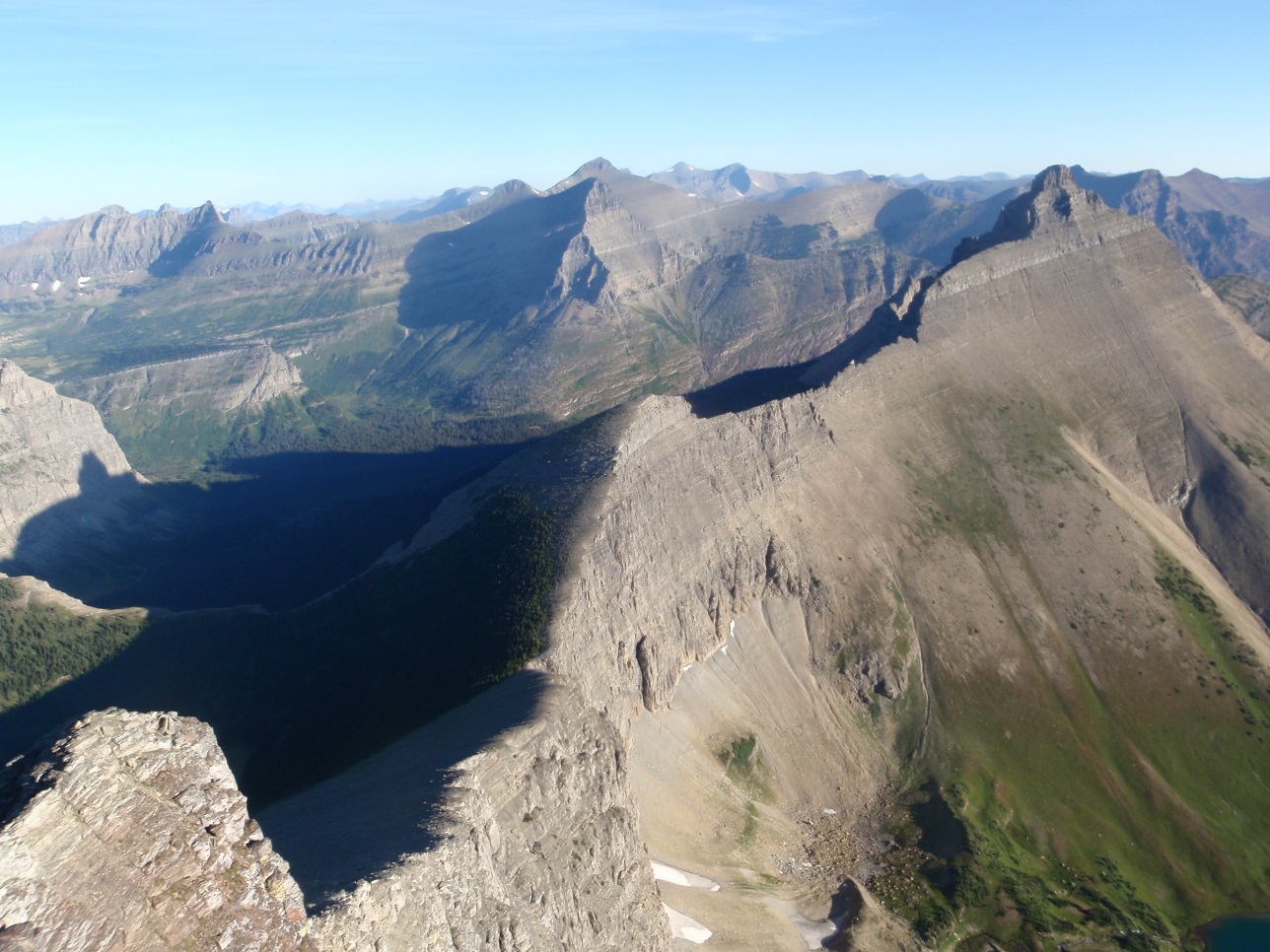 | Looking towards Split Mountain from Mt. Norris (the Divide goes left, following the white line in the shade) |