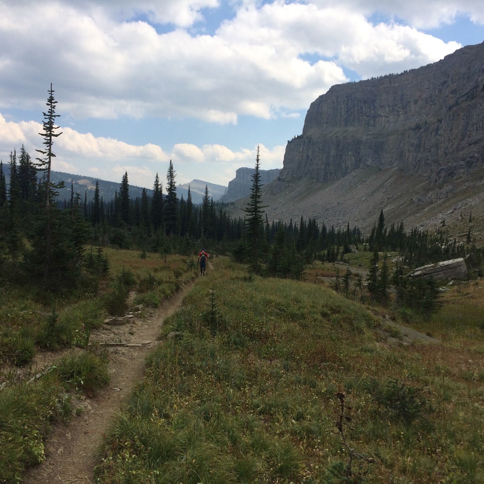 The next morning, 15 August, we made final decisions on cold weather gear, packs and hiking poles. The trip was set. We took off at the trailhead and started our ascent up Headquarters Pass at 5:50 AM. As we climbed the sun started to peak from behind us, so we started to drop our top layers. As we peaked, the wind was howling. The view of the Rocky Mountain, the tallest peak in the Bob Marshall Wilderness, was amazing. We started our descent and picked up our pace towards Gates Park. Throughout the trip, Kam schooled Wade and I on his knowledge of the Bob Marshall. Kam told us that Gates Park was owned by a gentleman named Cates, who owned the area for logging. Over the years the name of the park was changed to Gates Park. Kam was our personnel tour guide throughout the trip. Sharing his knowledge and his childhood stories of his summers in the backcountry of the Bob.
