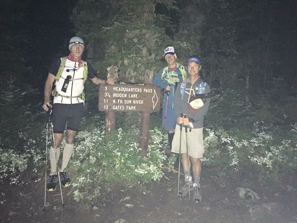 Kam had thought that there was no way that we would make it back to Benchmark after dark, he decided to leave his headlamp with Robin at the Headquarters Pass Trailhead. We had planned to meet Josiah Badger at Indian Point but figured we wouldn’t see him because of how far we were behind our planned timeline, and we didn’t. We proceeded onward towards the crossing of the South Fork of the Sun River. As we came upon the Pretty Prairie it was completely dark. Wade found a head lamp laying in the middle of the trail right in front of the Pretty Prairie trail marker. He gave it to Kam under the promise that he wouldn’t leave us behind. Kam laid eyes upon the headlamp and said, “I know that light. It belongs to the Badger’s (How Kam knows who owns what headlamp I will never know). With all of us with headlamps, we pressed on slowly with muscle and blister pain in full swing.